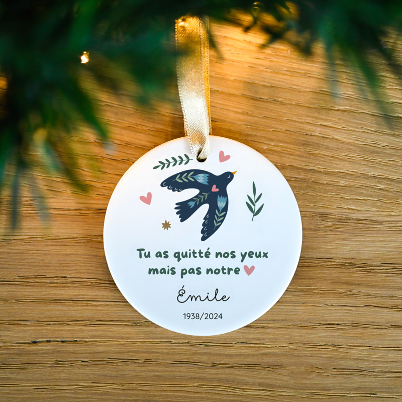 Cette boule de Noël « Mémoire » est en céramique et peut être personnalisée avec le prénom de votre proche et ses dates de vie. Suspendue sur le sapin, elle devient un hommage discret mais profondément touchant, intégrant la mémoire de vos proches disparus dans les festivités familiales. Cette boule trouve sa place parmi celles des autres membres de la famille, créant ainsi une harmonie entre passé et présent.