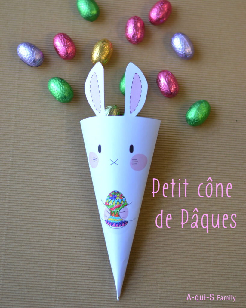 D’abord, il vous suffit d’imprimer le patron sur une feuille . Ensuite, il faut colorier le petit œuf tenu par le lapin. Puis, découper en suivant la ligne et pour finir coller les bords du cône afin de le fermer.