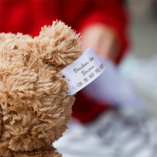 Pour les doudous les plus fragiles, aux poils longs ou dont la matière ne supporte pas la chaleur du fer à repasser, nous proposons également nos étiquettes à coudre.